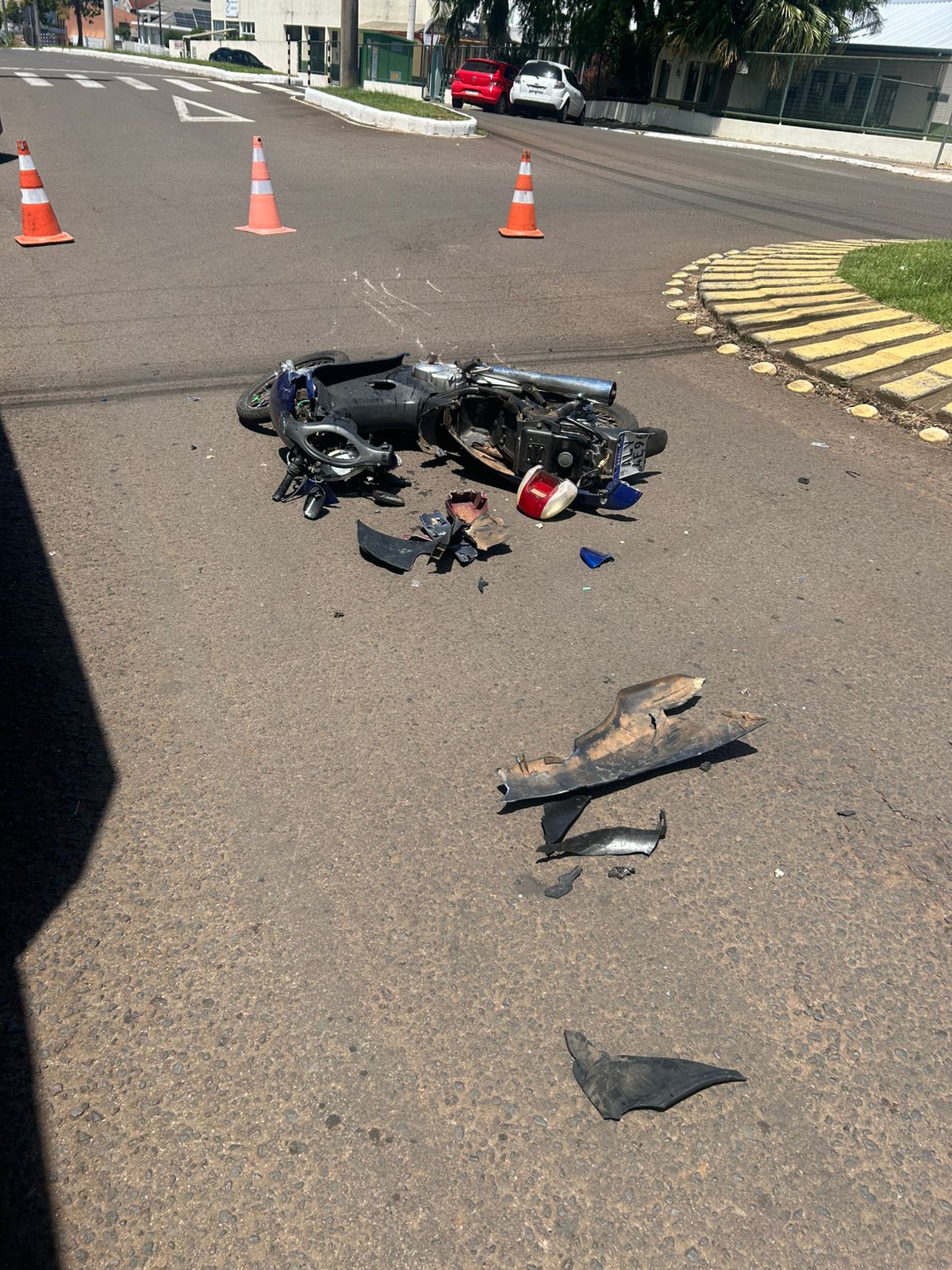 Uma colisão entre um carro e uma motocicleta foi registrada ao meio-dia desta segunda-feira (02), por volta das 12h01, na Rua Rio de Janeiro, esquina com Rua Dom Pedro II, região central de São Lourenço do Oeste.