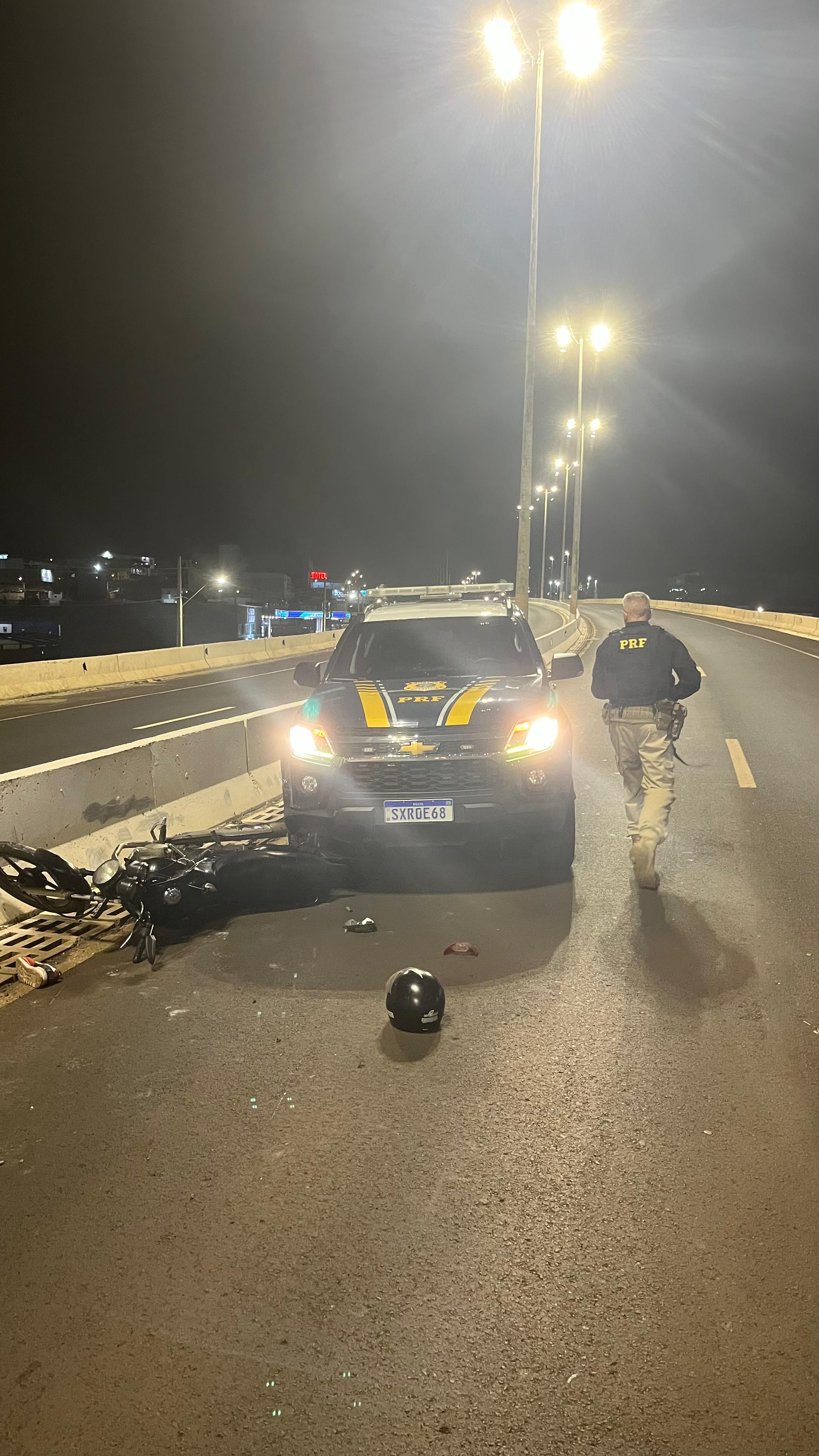 Em determinado momento, ao tentar evitar um carro, a motocicleta acabou colidindo contra a viatura da PRF. Com o impacto, os dois ocupantes caíram na pista. O condutor fugiu a pé pela região de um viaduto e não foi localizado.