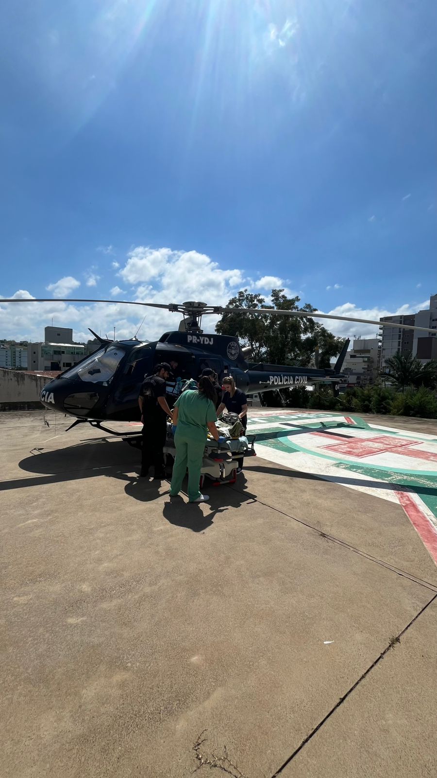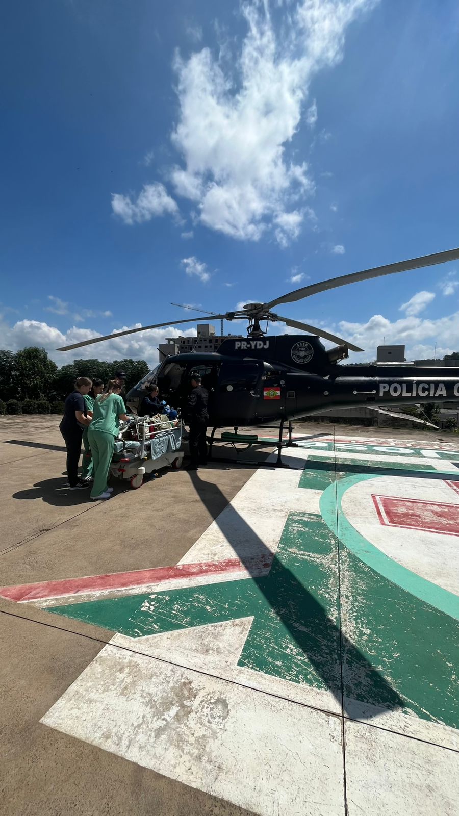 Após o atendimento inicial e estabilização no Hospital São José, em Maravilha, foi necessário o acionamento da aeronave do SAER-Fron, com apoio da equipe do SAMU Aeromédico, para a transferência do paciente.