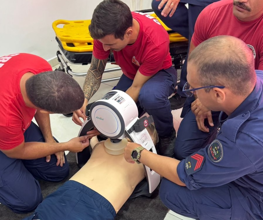 Durante as instruções, os participantes recebem treinamento específico para o manuseio do compressor torácico automático, equipamento utilizado para auxiliar na realização da reanimação cardiopulmonar (RCP), garantindo compressões contínuas e de alta qualidade em atendimentos prolongados ou de maior complexidade.