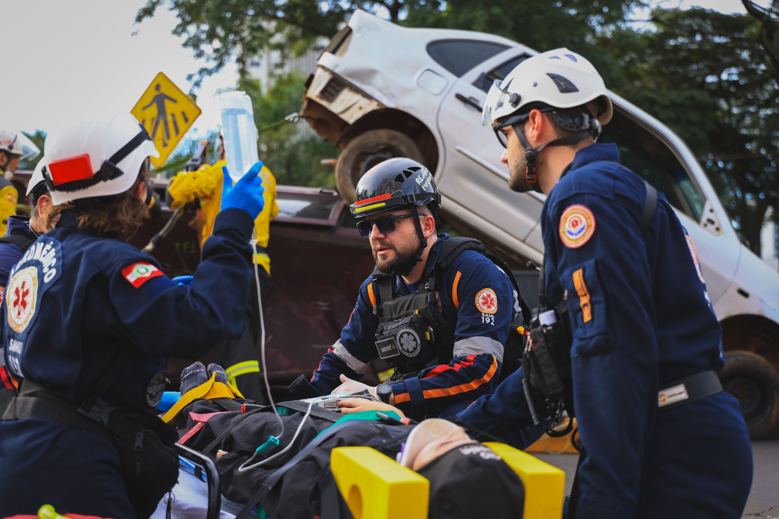 Para o exercício, foi montado um cenário crítico envolvendo a colisão entre dois veículos de passeio contra uma defensa metálica. Três vítimas foram contabilizadas, sendo duas presas às ferragens, com quadro classificado como TF1, situação que exige a utilização de técnicas avançadas de desencarceramento. As equipes utilizaram equipamentos hidráulicos para cortar e afastar a estrutura dos veículos, garantindo a retirada segura dos ocupantes.